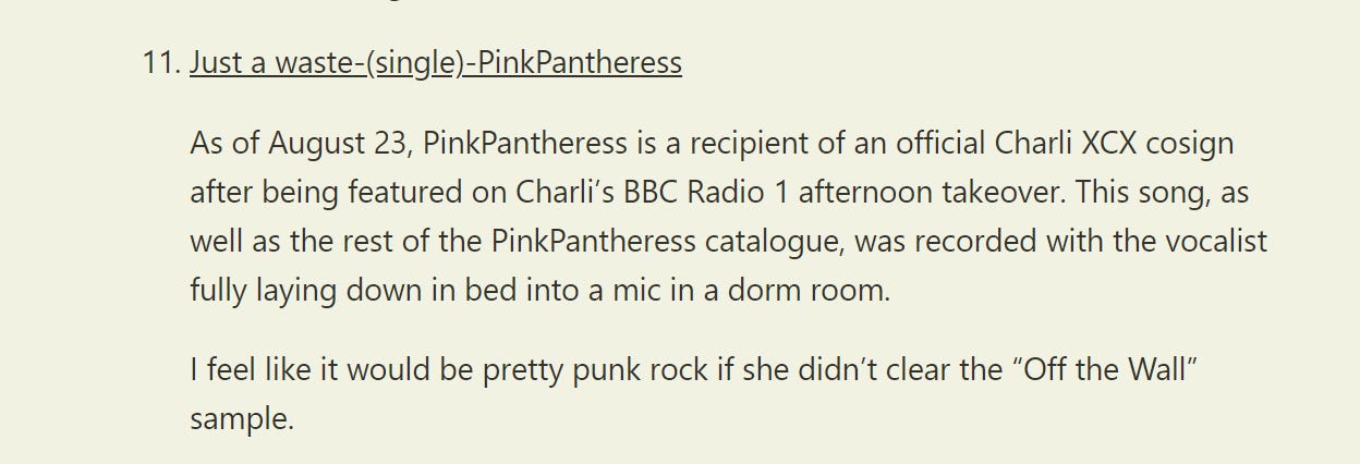 Some housekeeping to start. Dedicated readers will remember that I took note of PinkPantheress’s brazen use of a Michael Jackson sample in her track “Just a waste”.